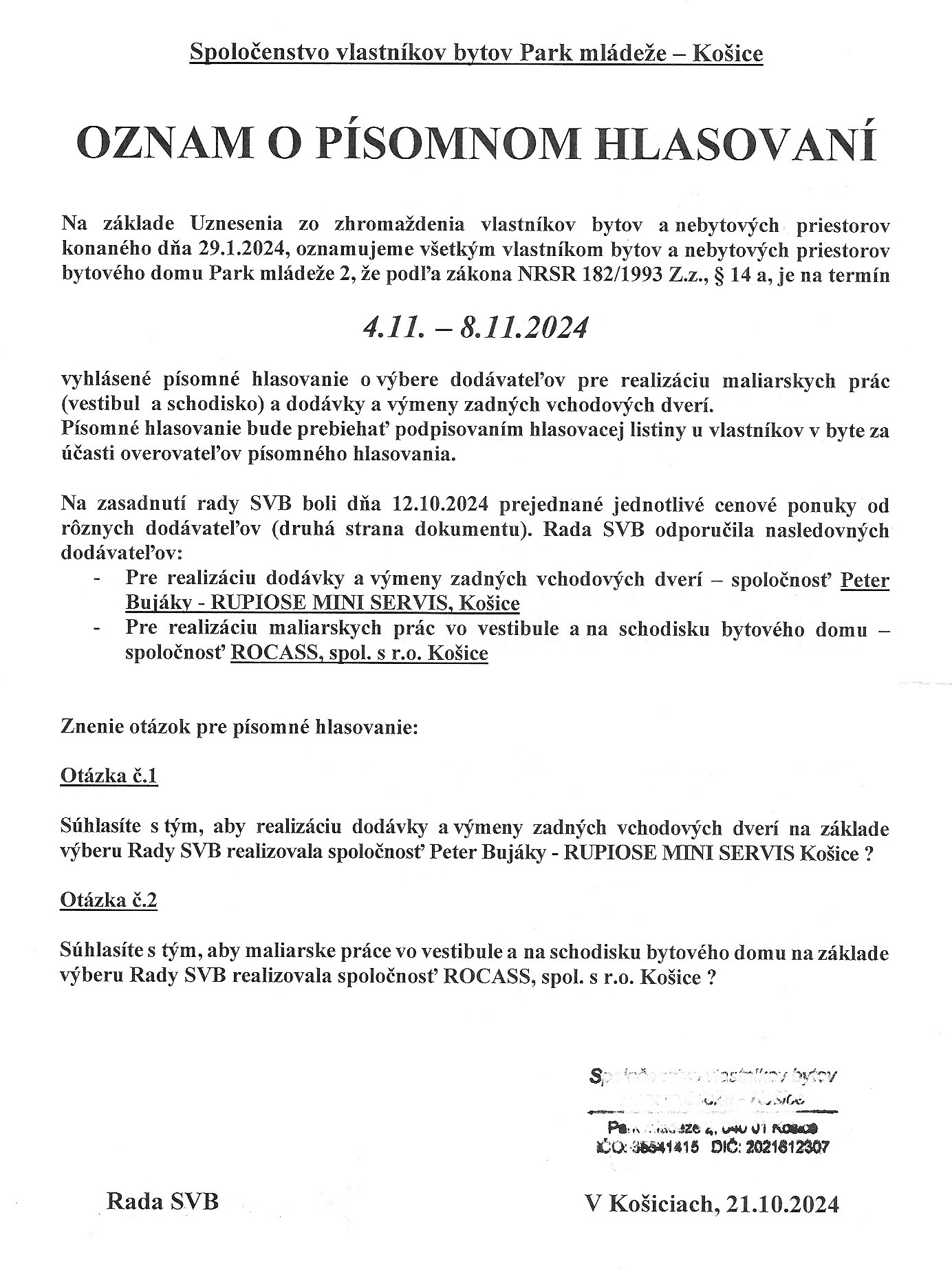 Oznam o písomnom hlasovaní - klikni